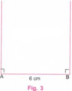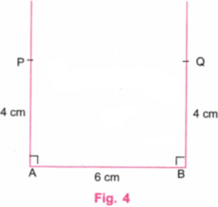 Step 3. Using a ruler, mark point P on the perpendicular line at A such that AP = 4 cm. Using a ruler, mark point Q on the perpendicular line at B such that BQ = 4 cm. (Fig. 4).