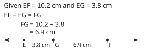 - Construct a line segment EF with a length of 10.2 cm. From EF, cut off EG, which measures 3.8 cm. Determine the length of FG.