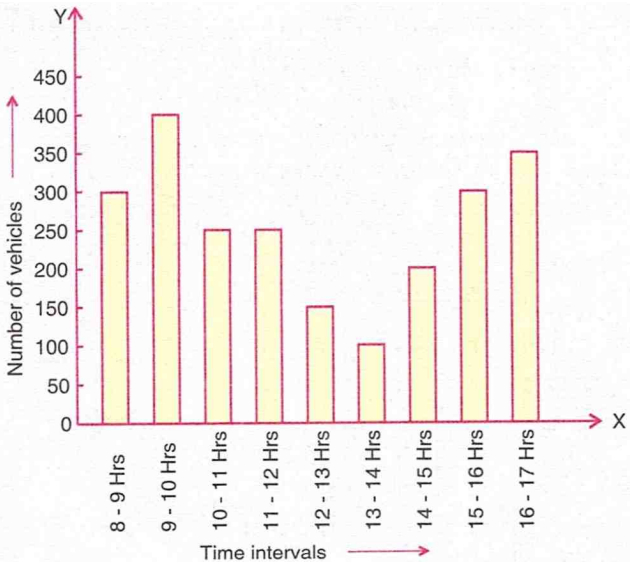 1. The bar graph represents the number of vehicles passing through a particular crossing of Delhi in different time intervals on a particular day. The maximum number of vehicles is 400.