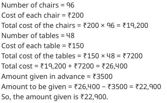 2. A school ordered 96 chairs and 48 tables. The cost of each chair is `200 and the cost of each table is `150. If the school gave `3500 as an advance, what amount is yet to be paid?