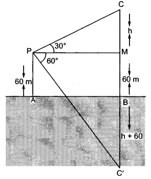 Let AB be the surface of the lake and P be the point of observation such that AP = 60 metres. Let C be the position of the cloud and C be its reflection in the lake. Then, CB = C'B. Let PM be perpendicular from P on CB. Then,{tex}\angle \mathrm { CPM } = 30 ^ { \circ }{/tex} and {tex}\angle C 'P M = 60 ^ { \circ }{/tex} Let CM = h. Then, CB = h + 60. Consequently, C'B = h + 60.