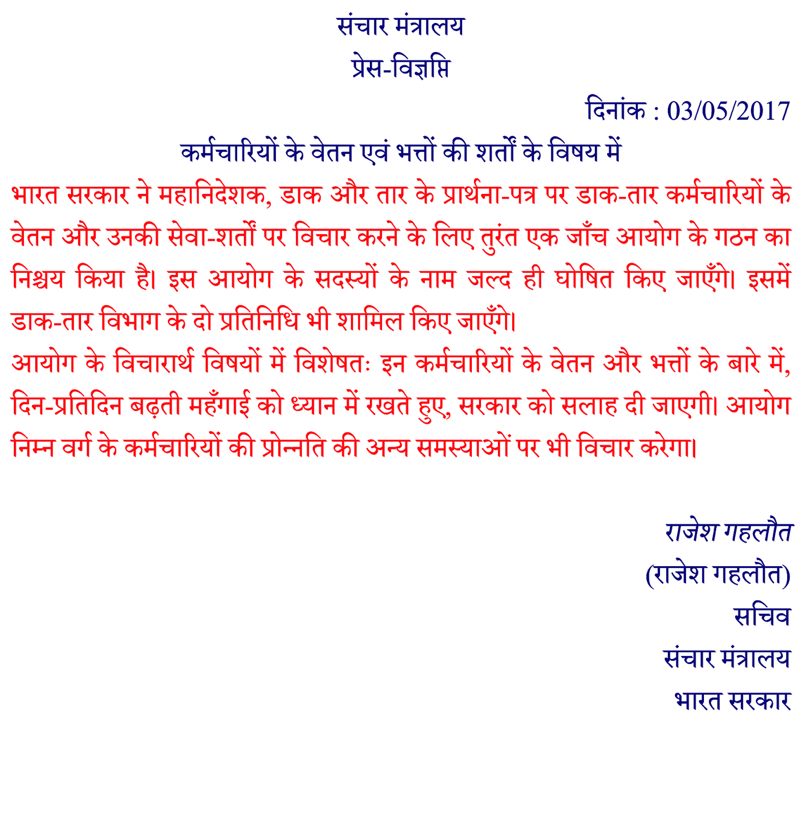 <div class="post-body-container" style="text-align:start; -webkit-text-stroke-width:0px"> <div class="post-body entry-content float-container" id="post-body-9045015280601467784"> <div dir="ltr" style="text-align:left" trbidi="on"> <div style="margin-bottom:7.5pt; text-align:justify">भारत सरकार के संचार मंत्रालय की ओर से कर्मचारियों के वेतन एवं भत्तों की शर्तों एवं आवश्यकताओं पर लिए गए फैसले की प्रेस-विज्ञप्ति जारी कीजिए।</div> <div class="separator" style="text-align:center">Posted by Shrushti Patil 5 years, 1 month ago (1617744)