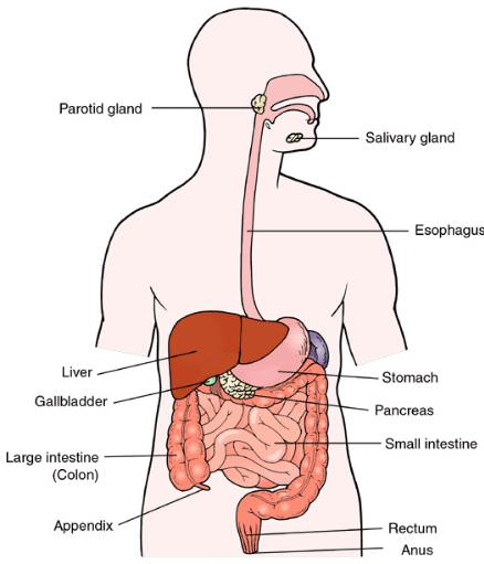 When we ingest food in our mouth, salivary glands of the mouth secrete saliva which moistens the food. It also converts the starch Into sugar. The tongue helps in chewing by moving the food in various directions. Saliva contains enzyme called salivary amylase which converts starch into sugar.Oesophagus Eh From mouth food goes into foodpipe called oesophagus. As food enters into the foodpipe, muscles of its wall start contraction and relexation movement. This movement is called peristaltic movement that pushes the food into the stomach. The peristaltic movement occurs throughout the alimentary canal. The oesophagus leads the food a sac like structure called stomach. The food is churned and partly digested in the stomach. The semi-solid food passes from the stomach to much coiled tube-like structure called the small intestine. The small intestine. serves two purposes—digestion and absorption of the digested food. It is about 20 feet long. The inner surface of the small intestine has a large number of fingerlike projections called villi. The Villi increase the surface area for the absorption of digested food. The absorbed food enters into the blood stream and carried away to various parts of the body for assimilation. The undigested food moves from the small intestine to the large intestine where mainly absorption of water from the undigested food takes place. From the large intestine the undigested food passes to the rectum which pushes it out of the body through the opening called the **** as faeces.