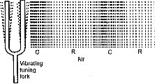 Air is the commonest material through which sound propagates. When a vibrating object, like prongs of tuning fork, move forward, they push the molecules of the air in front of them. This is turn compresses the air, thus creating a region of high pressure and high density called compression. This compression in the air travels forward. When the prongs of the tuning fork move backward, they create a region of low pressure in the air, commonly called rarefaction. This region has low-pressure low density and more volume. As the tuning fork continues to vibrate, the regions of compression in the air alternate with the regions of rarefaction. These regions alternate at the same place. The energy of vibrating tuning fork travels outward. This energy which reaches the ears makes the eardrums to vibrate and thus we hear the sound.