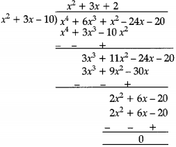 Dividing x{tex}^4{/tex} + 6{tex}x^3{/tex}+ {tex}x^2{/tex} - 24x - 20 by {tex}x^2{/tex} + 3x - 10