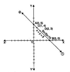 We plot the points A(0, 5) and B(5, 0) on a graph paper and join these points to form the line AB representing the equation (1) as shown in the figure, Also, we plot the points C(1, 4) and D (2, 3) on the same graph paper and join these points to form the line CD representing the equation (2) as shown in the same figure.