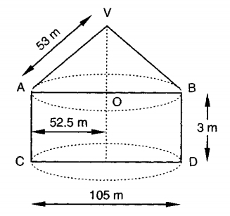{tex}= \left( 2 \times \frac { 22 } { 7 } \times 52.5 \times 3 + \frac { 22 } { 7 } \times 52.5 \times 53 \right) \mathrm { m } ^ { 2 }{/tex} {tex}{/tex}