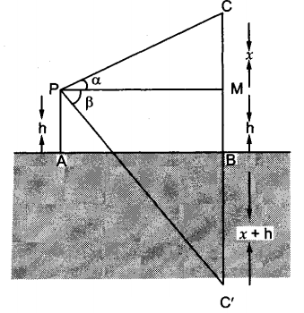Let AB be the surface of the lake and let P be a point of observation such that AP = h metres. Let C be the position of the cloud and C be its reflection in the lake. Then, CB = C' B. Let PM be perpendicular from P on CB. Then,