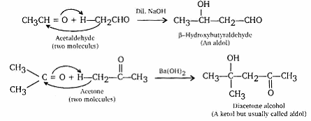 Aldehydes and Ketones having at least one alpha-hydrogen undergo a reaction in the presence of dilute alkali as catalysts to form Beta-hydroxy aldehydes (aldol) or Beta-hydroxy ketones (ketol), respectively. This is known as Aldol Condensation reaction. Example is shown below: