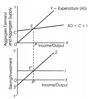 In the graph given, OP or OP' is the equilibrium level of income E is the equilibrium point where Aggregate Demand equals Aggregate Supply Equality between AS and AD implies the equality between S and I. When we extend the line EP vertically downward, it meets at point E' with S and L It is the equilibrium point of saving and investment approach OP or OP' represents the level of income at which the economy is in equilibrium.