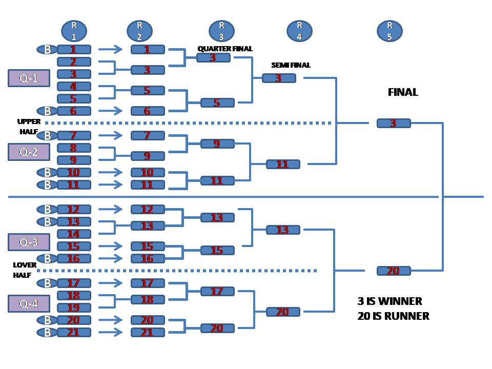 - Total number of byes = Next power of two - total teams = 32 - 21 = 11 byes