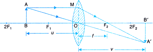 Derivation of lens formula for a convex lens. As shown in Fig, consider an object AB placed perpendicular to the principal axis of a thin convex lens between its F1 and 2F1. A real, inverted and magnified image AB' is formed beyond 2F2 on the other side of the lens.
