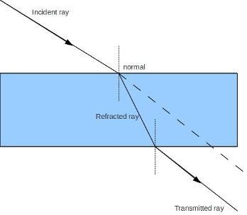 When a ray of light is incident on a rectangular glass slab, it gets refracted. After the refraction it comes out from glass slab. It gets a interface of a glass and the air (another medium). So it deviates away from normal. Since, the glass slab is rectangular and both sides of the glass slab have the same medium. The light refracts in such a way that incident and emergent rays are parallel.
